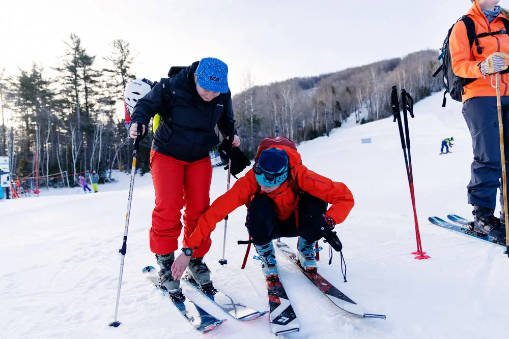 These days, McCarthy, who lives in Hanover, is IST’s executive director and one of 50 volunteers with backcountry experience who leads newbie-friendly weekend ski-touring trips at Greenwood’s Mt. Abram, ski area, where McCarthy is also the marketing director. As many as 60 skiers gather to skin up the mountain’s 1½-mile Roundabout and Sweeper trails every weekend, paying just $10 for the program and $5 for an uphill ticket (a lift ticket is $35), along with $40 to rent a full package of touring gear. (Participants with financial barriers can have program and ticket costs waived.) The arrangement lets skiers try out touring before investing in equipment — or simply try it once to say they have. Participants must know how to downhill ski, but plenty have never used skins or left groomed trails. IST’s outings offer a space where questions are encouraged and no one’s in a rush. But experienced ski tourers show up too, McCarthy says, often just to meet others who are into “earning their turns.”