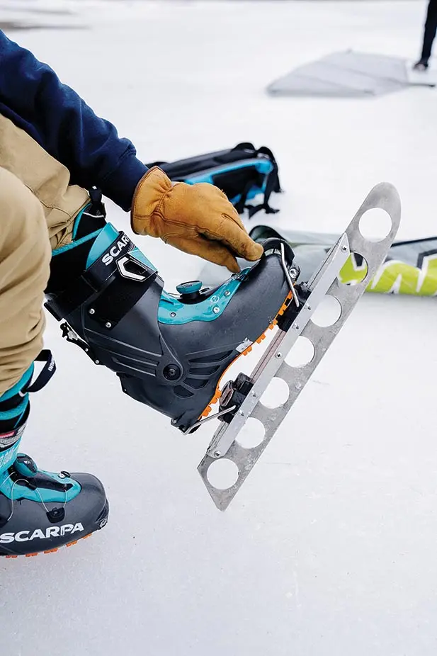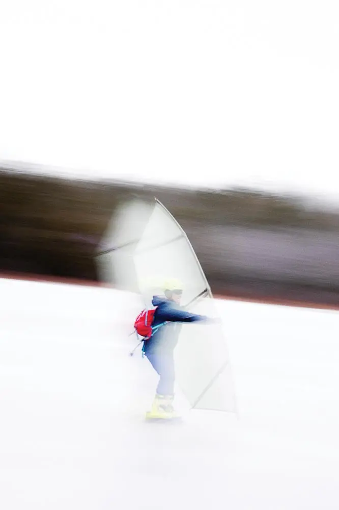 Her partner, Scott Carlson, taught 52-year-old Keefer how to wing sail on Nordic skates (with their long, detachable blades, forgiving on imperfect ice) using a kitewing — a lightweight, handheld sail. “It’s like flying,” she says. Maybe a dozen others wing sail north of Portland, Keefer estimates, and she’s met most: where there’s black ice and 10 to 15 knots of wind, they come flocking.