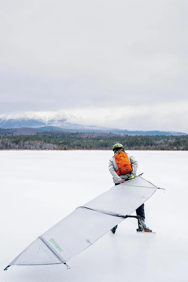 She met Warren’s Tim Hynd on Rockport’s Grassy Pond. Hynd, who’s 47, picked up wing sailing four years ago. These days, he and Keefer and a handful of other wing-sailing pals share information about ice conditions around the state. While perfect conditions aren’t common, Keefer, Carlson, and Hynd still get out on the ice almost every weekend, even if they have to drive a few hours (or sail on snowy ice with Nordic skis instead of skates). “Every day you go out is so different,” Hynd says. “You don’t know until you go.”