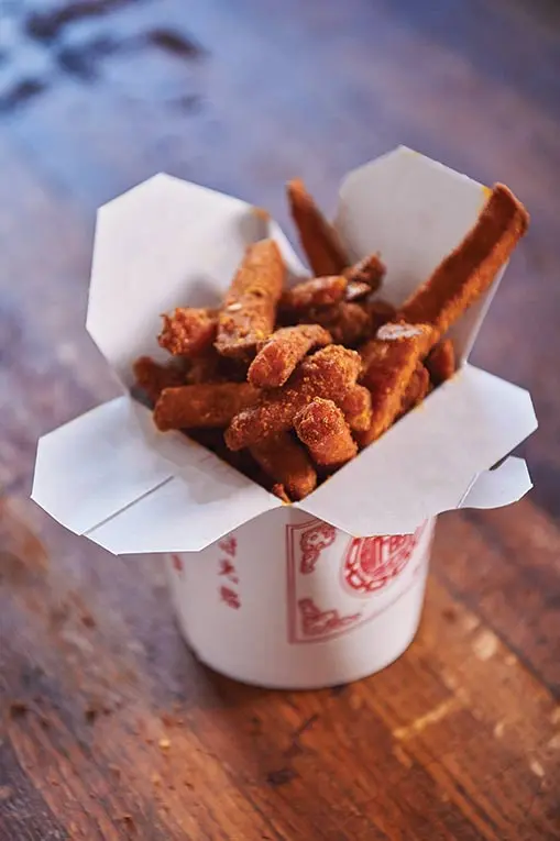 Maine Kebab’s menu is a build-your-own affair that revolves around six proteins: lamb kofta, beef brisket, grilled chicken, fried tofu, fried Halloumi cheese, and fried pork belly (the latter, McGarvey concedes, is “a little over the top”). Each can be wrapped in griddled flatbread or served atop turmeric rice or baby greens. They can also fortify bowls of hummus and spiced French fries. On the “snack” section of the menu, Best Brussels Ever — addictive flash-fried sprouts with crispy, charred exteriors — is easily shared two or three ways. Everything except the sprouts is also available as a side order. Dessert is baklava — flaky layers of filo sticky with honey and chopped nuts.