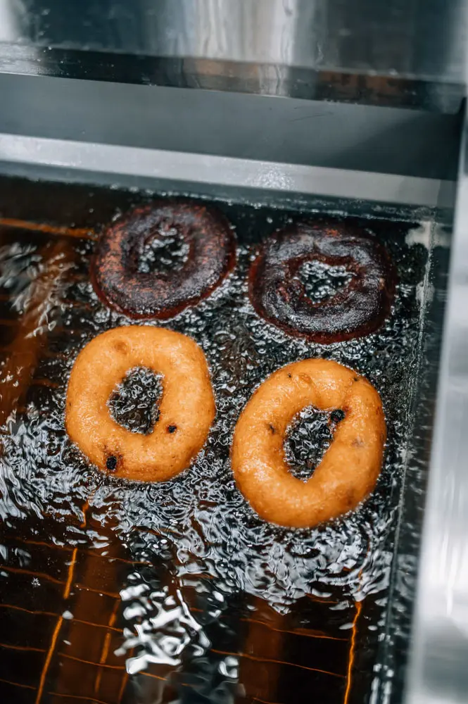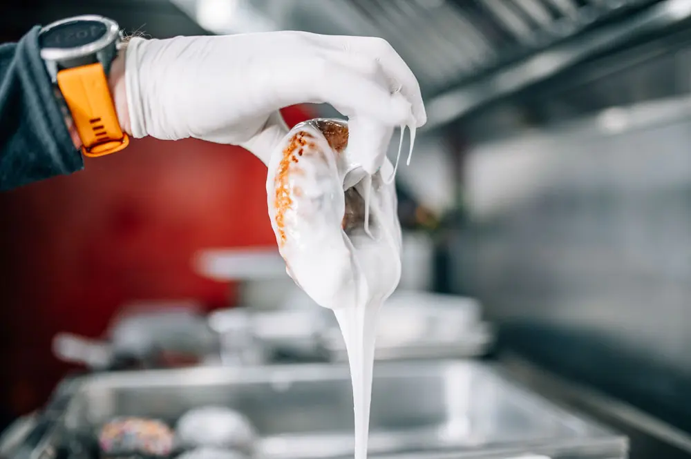 Last winter, Mark and Jennifer Tripp tried something new with their Ona-Tripp food truck: hitching it behind a snow-cat so it could be towed up some 1,000 feet of vertical to a mid-mountain perch at Sunday River. Their breakfast biscuits, wraps, stuffed sweet potatoes, and loaded fries proved a hit at high altitude, and the biggest draw was their cake doughnuts — plain, chocolate, and blueberry, plus some rotating options. Everything on the menu is gluten-free, from recipes refined via trial and error. (“You eat a lot of crappy doughnuts before you get it right,” Mark says.)
