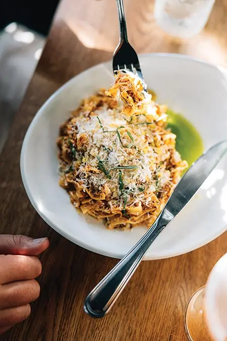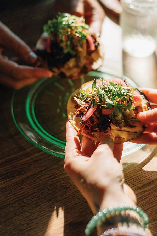 If one restaurant typifies Bethel’s new dining scene — splits it right down the middle, with food, drinks, and ambience that mix fun and refined — it’s Mountain Social. Cody and Pavlina Gordon, opened Mountain Social last winter as a spinoff of Project Social, one of their two Bar Harbor establishments (the other is the locally beloved Leary’s Landing Irish Pub). Putting 180 miles between kitchens seems like a risk, in terms of quality control, but the cooking doesn’t suffer even the slightest. Chef Brian Weber oversees the menu at all three of the Gordons’ restaurants, and guests familiar with Project Social will recognize some of what’s offered at Mountain Social, like the smoked-trout dip or the duck tacos. Those duck tacos, especially, are a standout: tortillas griddled to the inflection point between chewy and crisp, and the sweetness and acidity of green-apple salsa verde and pickled red onion balancing against the richness of the braised and shredded duck.