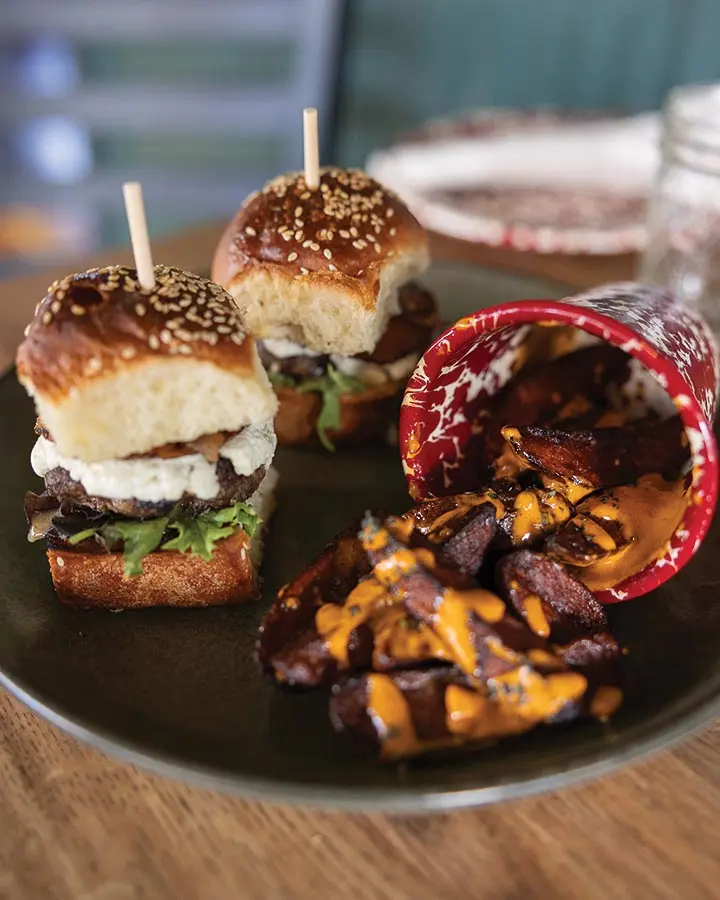 Another holdover from Project Social is the salad of kale and brussels sprouts, which sounds mundane and probably a little too healthy but would in fact be a shame to skip. The kale and brussels are so finely shaved that, tossed in an earthy-sweet miso vinaigrette, the raw, fibrous greens turn remarkably tender, and sesame seeds and toasted cashews lend a nutty undertone. Some of the other best dishes, though, are unique to Bethel. Take, for instance, the beef sliders, that staple of mediocre sports bars everywhere, usually undersized and overcooked. At Mountain Social, the patties are cooked to an ideal point right between medium and medium-well, and they’re topped with crispy pancetta, smoked ricotta, tomato jam, and caramelized onions for a melding of salty, smoky, and sweet notes. The towering buns, from the local Gamut Goods bakery, look like too much bread, but they’re exquisitely airy — carbohydrate clouds, basically.