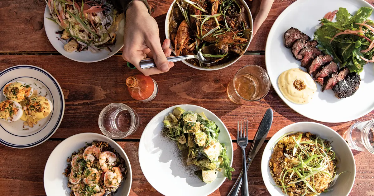 At lunch, sandwiches anchor the menu — po’boys, pimento grilled cheese, root-beer–braised pulled pork. Sunday brunch features eggs Benedict with Louisiana tasso ham, plus pancakes with pecan butter and rum syrup.