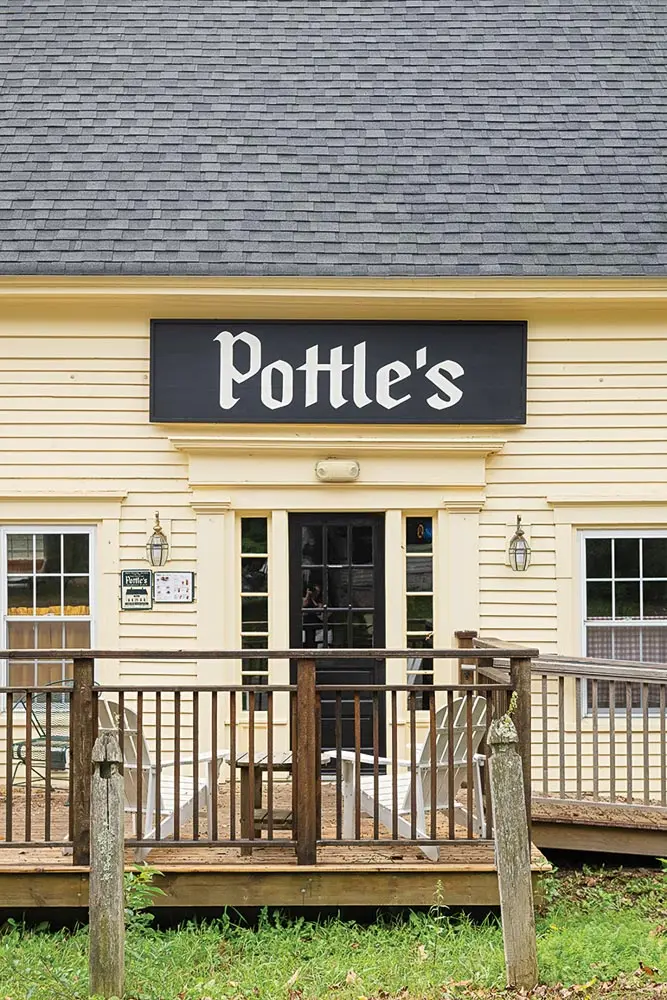 Pottle’s, which opened last summer in Liberty village, is a den of homeyness. The barroom is dark and intimate, with exposed wooden beams, red-checkered curtains, and a built-in bookcase stocked with vintage tomes and painted a deep blue-gray to match the walls. The adjacent dining room is brighter but no less cozy, with a fireplace, chef Isiah Pottle’s vintage family photos on the walls, and an upright piano that guests play with varying skill.