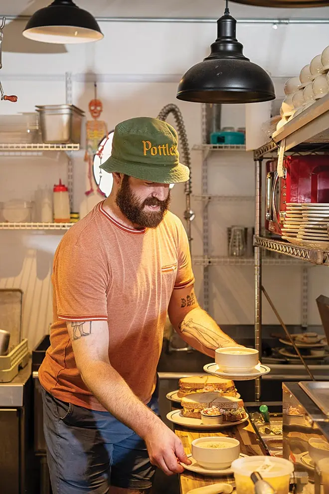 Pottle sees his tavern, which he co-owns with his sister, Amy Smith, as a counterbalance to high-end restaurants offering entrées with 10-word names. “We want it to be approachable,” he says. “This is familiar food that you don’t make for yourself often enough — pure comfort.” Pottle, who’s in his mid-30s, has been cooking professionally since he was a teenager slinging pizzas at the Lincolnville General Store. In his early 20s, he managed Zoot Coffee, in Camden, then moved a few doors down to cook upscale Thai cuisine alongside five-time James Beard Award nominee Bas Nakjaroen at Long Grain. After a stint at a vegan bakery in Rhode Island, he moved out west and eventually settled in Oregon, where he worked successively as a bartender, coffee roaster, marketer, rug maker, and, finally, partner in a steamed-sandwich shop.