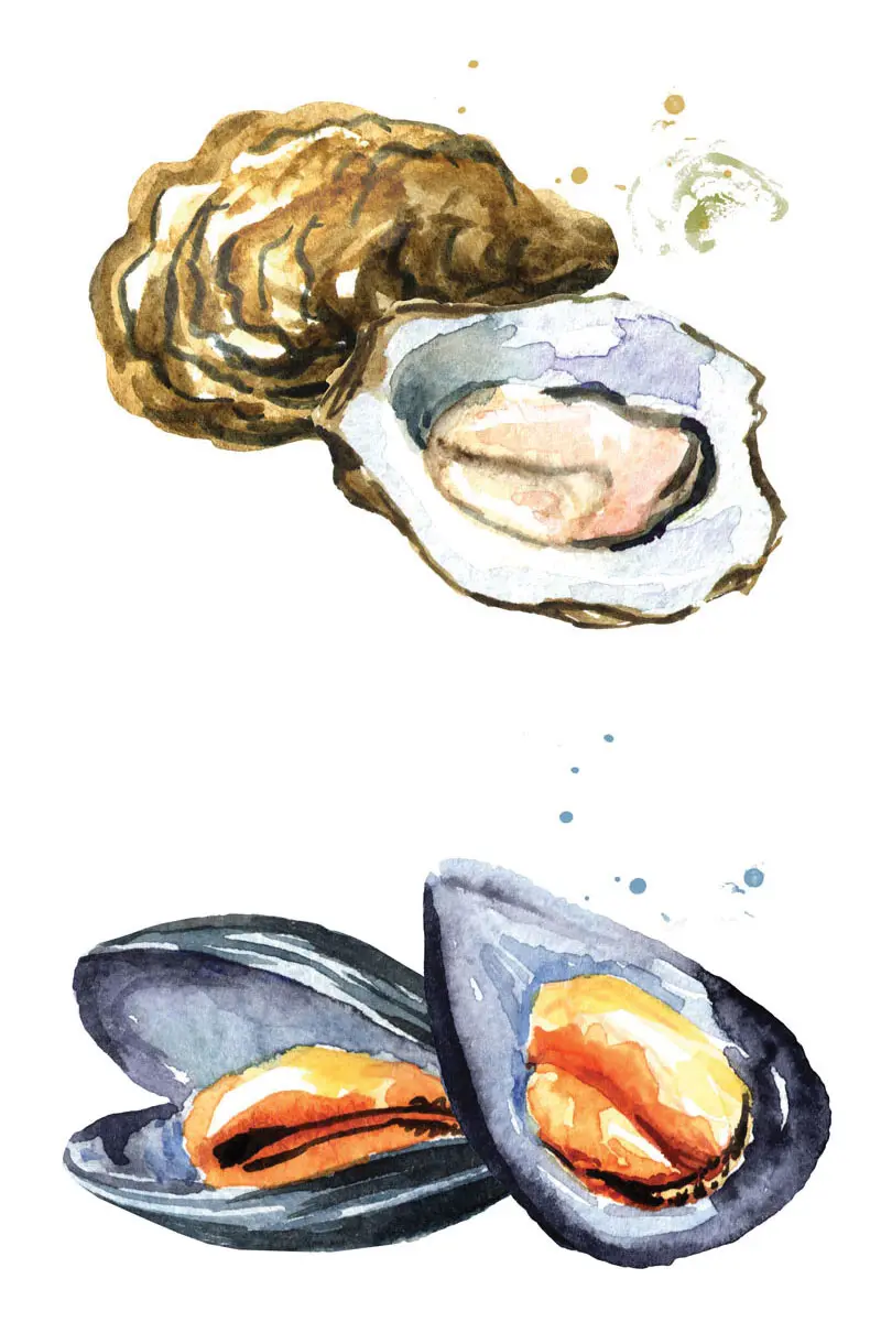 An equal quantity of mussels, weight-wise, has more than double the protein of oysters. So you can feel okay about dredging a thick slice of bread through that buttery wine sauce they’re traditionally cooked in.