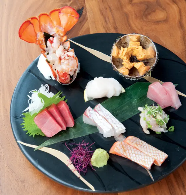 On a recent night, the five-course tasting menu (a deal at fifty dollars) began with a sushi plate that included lobster tail, cooked for just a few minutes and served inside the shell drizzled with garlic atop a piece of seaweed. The lobster shared the plate with melt-in-your-mouth sea bass, hamachi (yellowtail), fluke, and salmon.