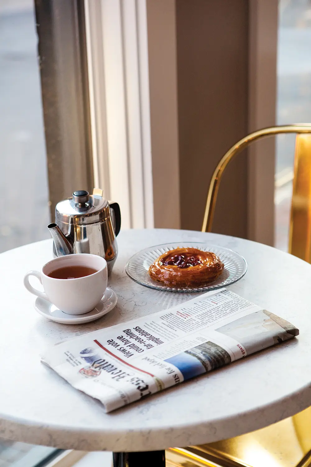 Housed in a renovated Victorian building with high ceilings, Portland Pâtisserie has a design sensibility that’s one part Louis XVI, one part midcentury modern. The room has a streamlined decadence, with crystal chandeliers encased in metal spheres above gilded, minimalist café chairs and marble-topped tables. Natural light fills the room, pouring through floor-to-ceiling picture windows that allow for excellent people watching.