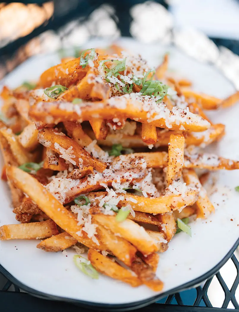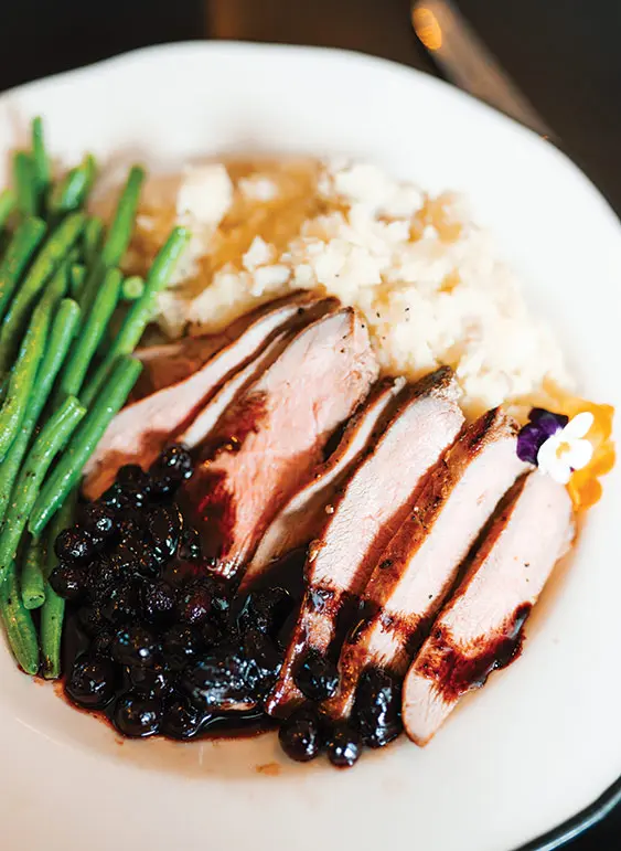Mary heads up the front-of-house and the kitchen and likes to make recipes she and Don have honed at home, while Don manages operations and mans the grill and fry station. Mary does most everything from scratch, from pasta to pastries to scallion mousse (the latter goes with ham, asparagus, and cheddar for a grown-up spin on grilled cheese, a rotating offering). And while some customers call ahead and reserve her often-sold-out beef, pork, and veal meatloaf, the dinner menu goes beyond upscale homestyle. Green-chili barbecue pork, with fire-roasted peppers, is heaped over a griddled masa corn cake. Vegans, meanwhile, might opt for the cauliflower puttanesca or the “zoodles” — zucchini noodles tossed with sesame peanut dressing and bell peppers, carrots, scallions, and pea pods. The local duck breast, smothered in a sauce of wild blueberries and balsamic vinegar, was accompanied by a comforting mound of creamy mashed potatoes — typical of the way Mary and Don balance heartiness and finesse.