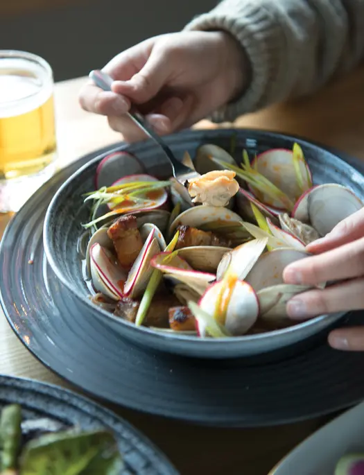 There’s a little too much going on in our second appetizer — tender sautéed squid with charred Brussels sprouts, pickled vegetables, and sun-gold-tomato sauce. The dilly beans and tomato puree overpower the squid. Far more successful is Salt Pine Social’s take on the Japanese comfort staple asari no sakamushi — clams steamed in sake, complemented by rich, crispy pork belly and a dash of chili oil and served in green stoneware bowls. It comes with naan to mop up the aromatic broth.