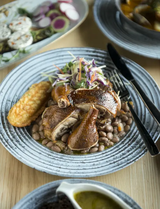 Located in a renovated house with attached storefront, just steps from Bath’s Waterfront Park, Salt Pine Social’s sprawling dining room wraps around an entirely open kitchen. Depending on where you’re sitting, you practically experience the meal from the perspective of behind the line — which finds me resisting the urge to jump in and help expedite chits. Furnishings are sleek, blond-wood tables with black chairs. Soft-gray walls are accented by large, boldly patterned rugs woven by local artisan Hector Jaeger. A cluster of colorful, exotic pendant lights is suspended over the bar.