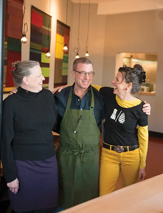 At Salt Pine Social, co-owners and sisters Daphne Comiskey (top, left), who oversees the front of the house, and chef Eloise Humphrey (top, right), have teamed up with executive chef Jeff Kent (top, center). Among the menu standouts: a rich seafood stew and, off the dessert menu, a perfectly simple pear frangipane tart.