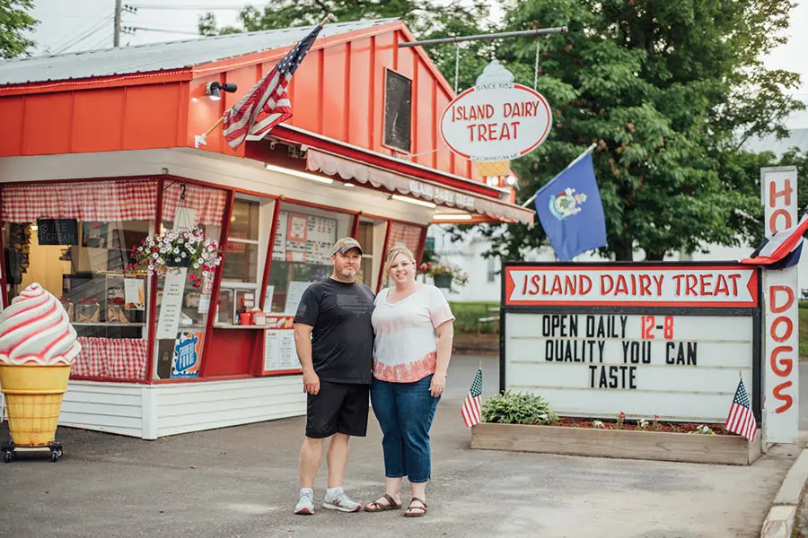 With its classic red-and-white trim, angular glassy front, and nightly neon glow, the Island Dairy Treat looks like it time-traveled straight from the 1950s, and in a sense, it has. This summer marks 70 years since the roadside ice-cream stand opened in Skowhegan, on an island in a bend of the Kennebec River, above a hydroelectric dam. Not much has changed about the place, and on a recent warm afternoon, some dozen families, young and old, were sitting around picnic tables shaded by maples, much as families have done for generations. One woman tried, without much success, to school her young daughter on licking around the cone to keep the chocolate-vanilla swirl from dripping, but sticky fingers are a rite of summer here.