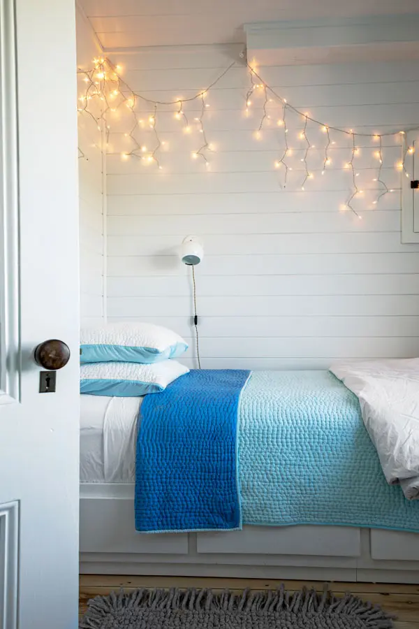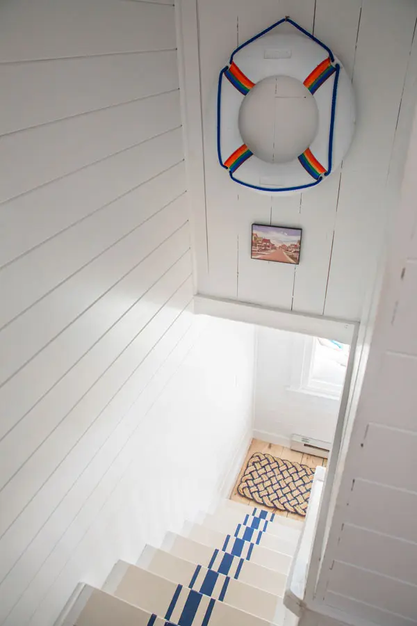 Garnet Hill, one of McEvoy’s best clients, holds regular sales for employees, which is where she scored the teal-and-turquoise quilt atop the captain’s bed from Gothic Cabinet Craft. A vintage door from Kennebunk’s Habitat for Humanity store, outfitted with vintage hardware from Old House Parts, completes the look. McEvoy spotted staircase striping on Pinterest and decided to paint it herself — which was, she says, a lot harder than it looks.