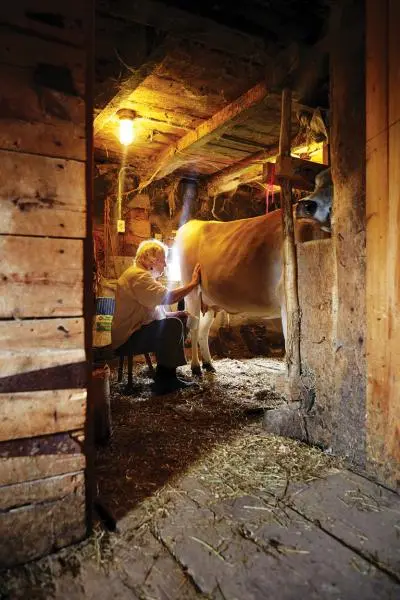 Back on the farm this drizzly Saturday morning, Grohman — gray-haired and slightly bent from years of farm work — tugs a red four-wheeled farm cart slowly across her puddle-strewn dooryard. Inside the barn it is dark and cobwebbed. A loud chicken scurries past, trailed by squeaking chicks. Grohman parks the cart in the milking room and shuffles away. In some unseen corner of the barn a sheep bleats and a rooster crows. The air is ripe with sawdust and damp hay.