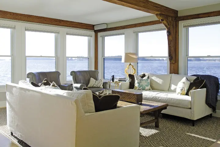 In the main living space, leather chairs swivel to face the fireplace or the distant views of Staples Point and Winslow Park. The open design and large kitchen with polished granite bar allow the Links to comfortably entertain as many as 50 guests.
