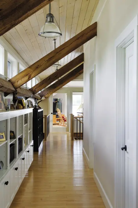 A long row of white-painted wooden cubicles displays family heirlooms and knickknacks in an upstairs hallway that leads to the media room and an outdoor balcony. An open bridge with contemporary iron rails leads to the bedrooms.