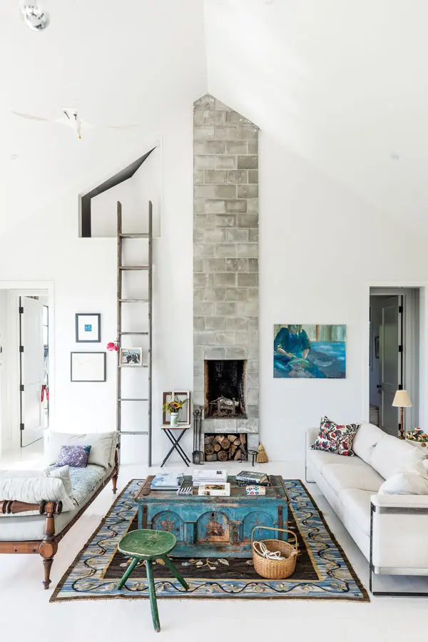 ABOVE 1) Berman and Horn lean against an inconspicuous guesthouse door. 2) A cinderblock chimney, ladder to a sleeping loft, and paper-seagull kite accentuate the living area’s lofty scale. The 19th-century daybed and coffee table/trunk and 1970s sofa are from flea markets and resale shops Berman, who created the large painting, frequents. 3) A burled-fruitwood chest and gilded mirror, flanked with 1950s French metal chairs from Marston House, face the guesthouse bed. 4) The screened-porch entrance to the guesthouse belies the expansiveness inside.