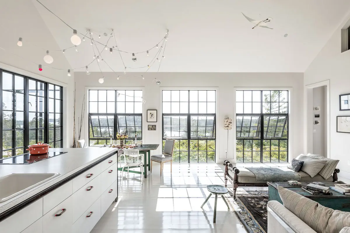 Outfitted with 1960s metal patio furniture, an Ikea dining table base paired with a cedar top Horn made, and garlands of string lights that echo the starry canopy, the porch allows Berman and Horn to essentially live under the sky “without spraying ourselves with DEET,” she says. As for the seagull droppings neighbors predicted would splatter the transparent ceiling? They haven’t materialized, a blessing Maria Berman credits to the ospreys and bald eagles that haunt the property.