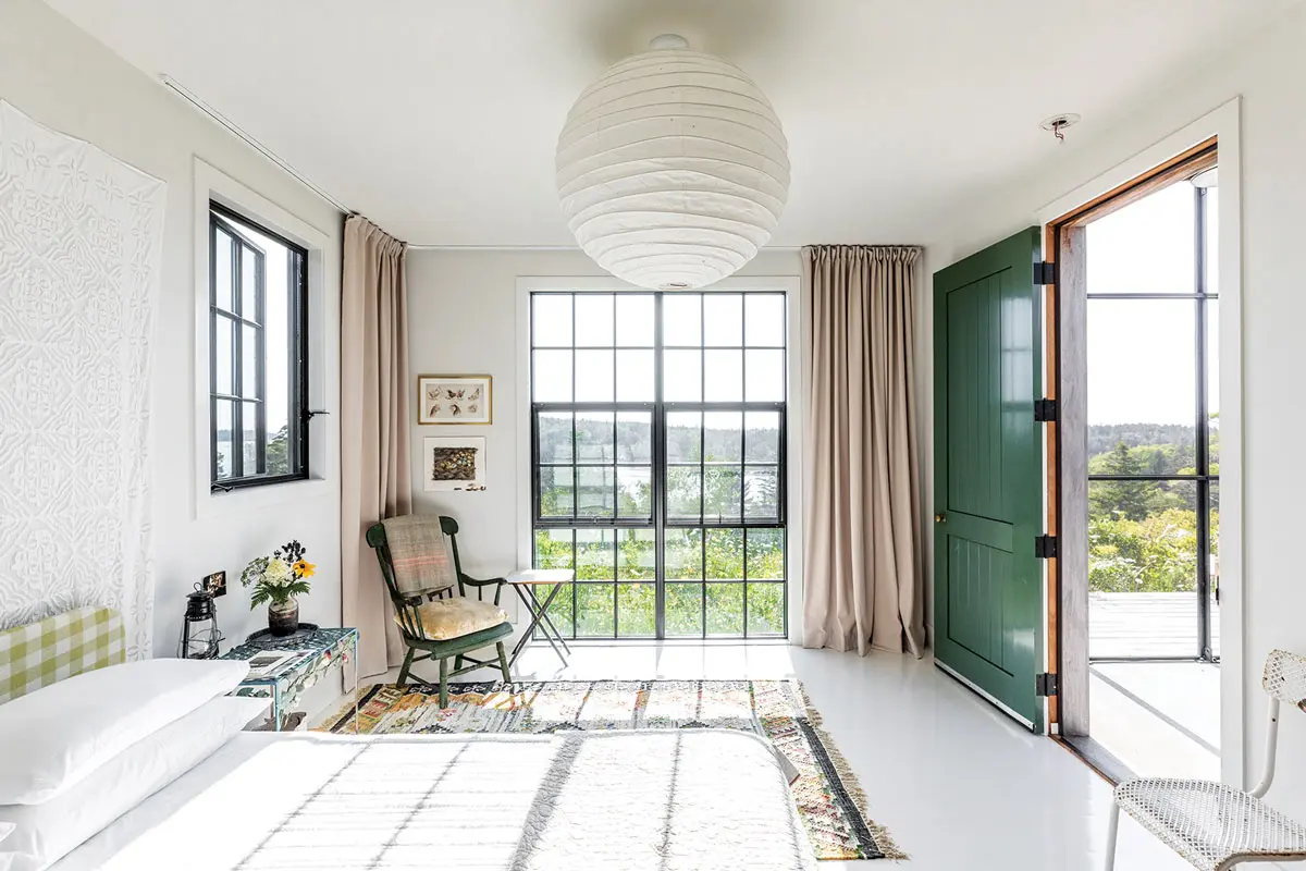 ABOVE 1) In the kitchen, loosely draped string lights, fitted with various types of bulbs to resemble flotsam caught in nets, add economical illumination and a sense of fun. A weathered-wood table from Vinalhaven’s Marsten House and vintage chairs fairly float atop birch floors coated in glossy deck paint. 2) A vintage Isamu Noguchi paper lantern illuminates the room, whose fresh-green notes on the door, vintage rocking chair, kilim-like World Market rug, and headboard the couple designed pick up the lush surroundings.