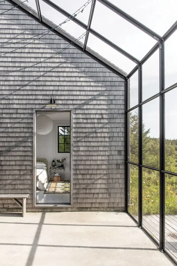 When they got to work, questions about how to give guests a measure of privacy and prioritize the lofty cove view began to shape the entire project. Their answer: a contemporary riff on a New England connected farmhouse with an open-plan main house at one end and a small guest cottage at the other. Joining the shingled wings is a grand screened porch — its lightweight aluminum frame fabricated by Rockport Steel — that allows for clear views, straight through the structure, to the water. “At the end of the night, we say goodbye to our guests and we each walk across the 15-foot stretch back to our sides of the house,” Horn says. “It’s a nice ritual.”