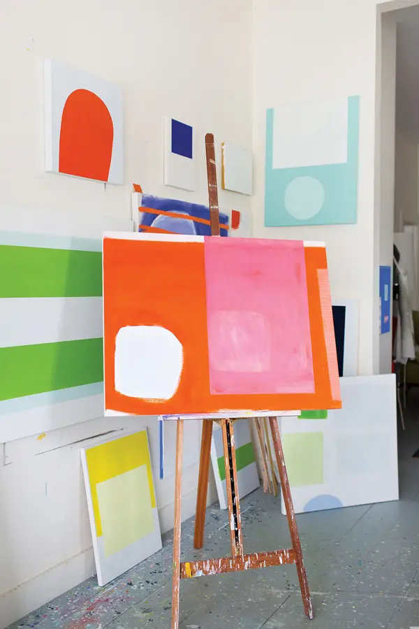 In her light-filled SoPo studio, Laurie Fisher ponders, procrastinates, and eventually paints her arresting, organic-geometric works.