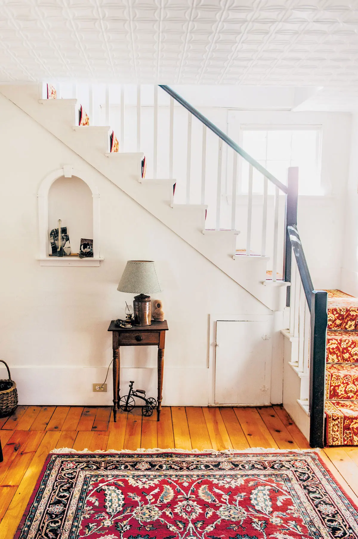 The three-bedroom house is simple by today’s standards, but architectural details, such as the decorative tin ceiling in the entryway and wide-plank wood floors, lend it charm and character that are hard to find in new construction.
