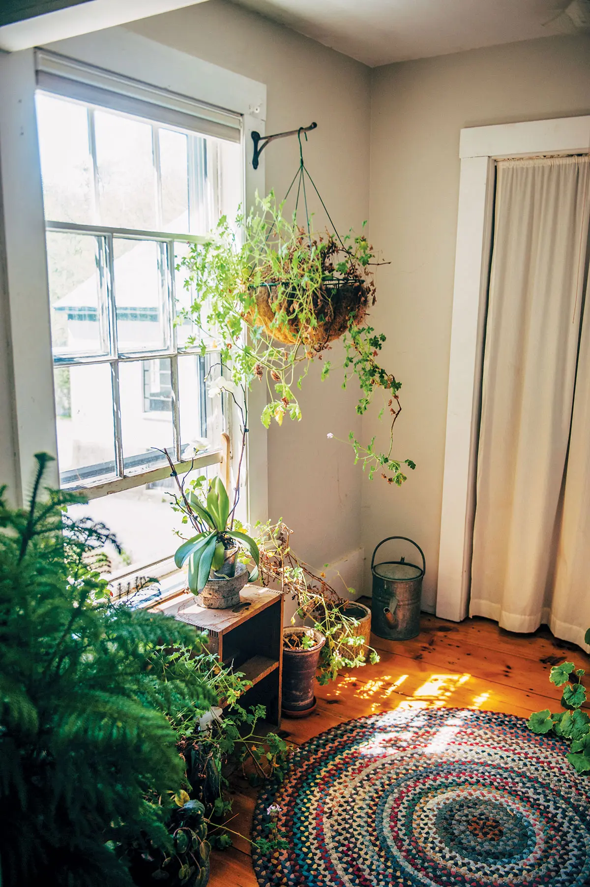 More plants are gathered in front of the window in the sitting room and hang in the upstairs bathroom. The roomy entryway to Vogels’ upstairs bedroom serves as a space for yoga and meditation.