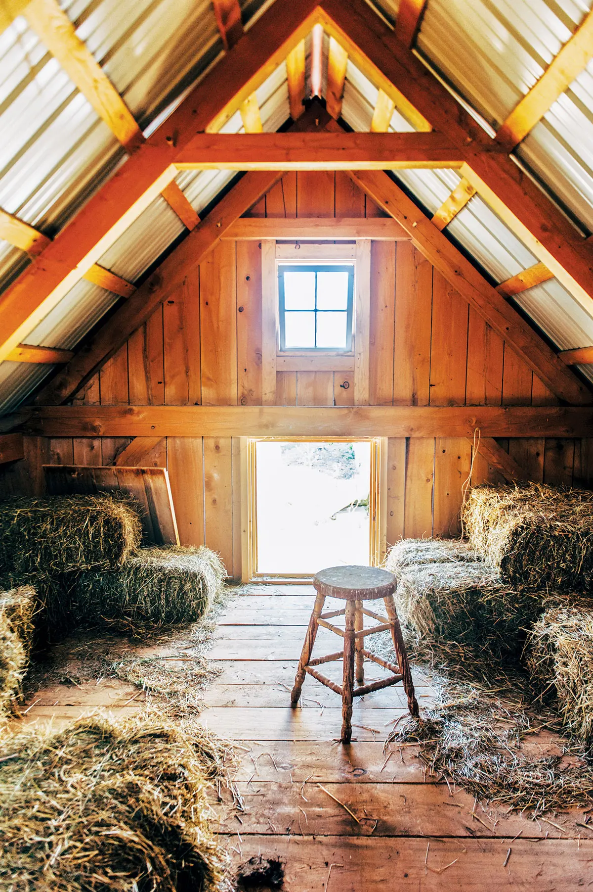 Vogels leads me outside to the barn, which he built with a friend. Our feet sink in the soft, thick layer of hay covering the floor. The second story, where hay bales are stored, is warm from the sunlight streaming in the windows and radiating from the metal roof. “This is a great place to be when it’s raining,” he says.