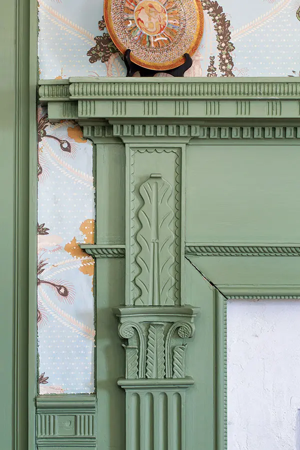 ABOVE A formal parlor in Union’s Alden House features elaborately carved woodwork, period-appropriate plaster fireplace parging, and reproduction 19th-century wallpaper with a neoclassical motif. The “second-best” parlor, used by the Alden family, is slightly less ornate than the formal parlor reserved for guests.