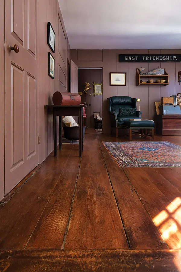 Many photographs survive from the 1960s restoration, making clear that the work was done with care to preserve as much original material as possible and accurately replicate what was lost. Fortunately, original doors, paneling, and other elements had been stored in the barn when they were removed for Victorian-era updates. These were returned to their initial locations, and missing pieces were reproduced using Alden’s own tools in some instances. Accordion lath-and-plaster walls were removed from the vertical board paneling in the rear of the house — the boards were painted before the lath was installed, indicating that they had been the original exposed surface.