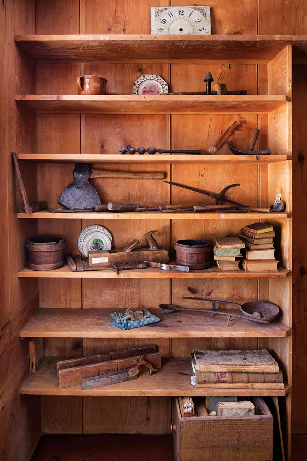 ABOVE A simple “back” bedroom in the Alden House might have been a nursery. Many of Ebenezer Alden’s tools remain in the home. Alden carved the mantels.