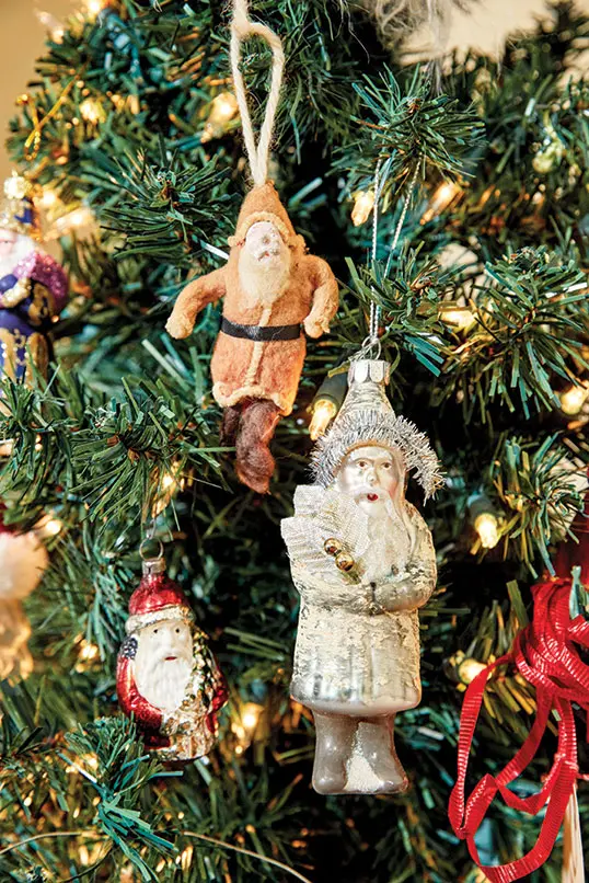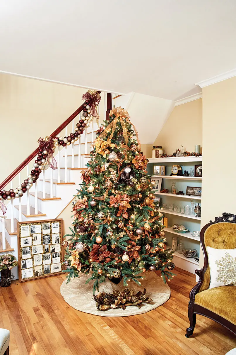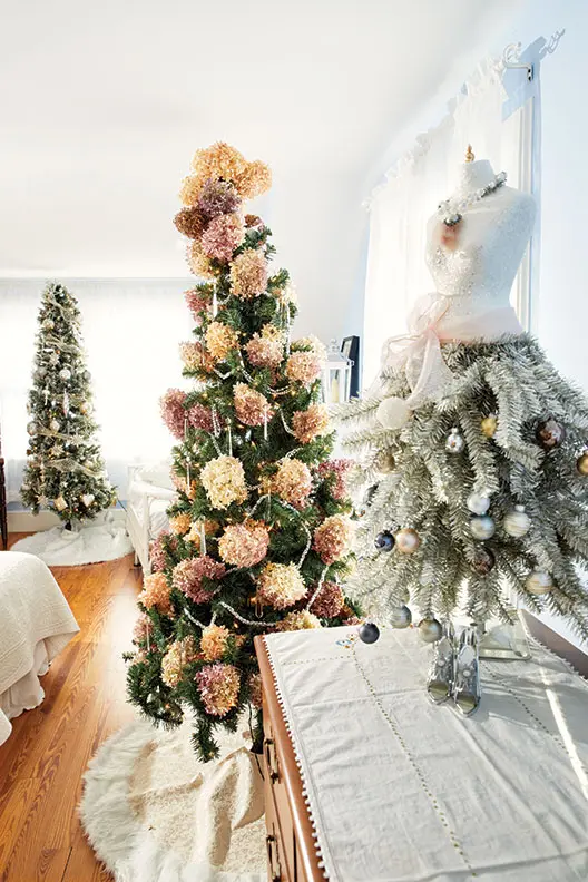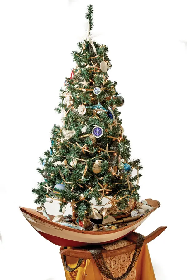 How many trees does she have now? “That’s a question without an answer,” Kane says. This time of year, there are pointy firs on a windowsill, the mantel, in the dining table centerpiece, and lining the streets of the Christmas village. Then there are the 15-plus themed trees, which, in recent years, have included a white “My Fair Lady Tree” with black-and-white garland and a sequined top-hat crown; a “Seacoast Tree” with nautical ornaments, a rocking dory stand, and a yellow-slicker skirt; a “Hydrangea Tree” with glass prisms and giant blooms; a “Family Tree,” with framed photographs of seven generations of kin; and a “Tree Tree,” with, yes, dozens of tiny tree ornaments. What you won’t find anymore is a real Tannenbaum. “Once I started putting up all these trees, well, it takes so darn long,” Kane says. “The live tree just didn’t cut it.”