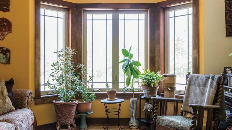 In a bay window in the living room, painted Brown Mustard by Olympic, citrus, bay, and rosemary plants flourish in terracotta pots by Sarah. The casements’ modern grids nod to Spanish Revival iron grates, and their rich moldings reference the seating. In her eclectic, colorful abode, Sarah says, “I can have dark, old furniture, but it doesn’t make the house dark. It’s still got a friendly, welcoming vibe.”