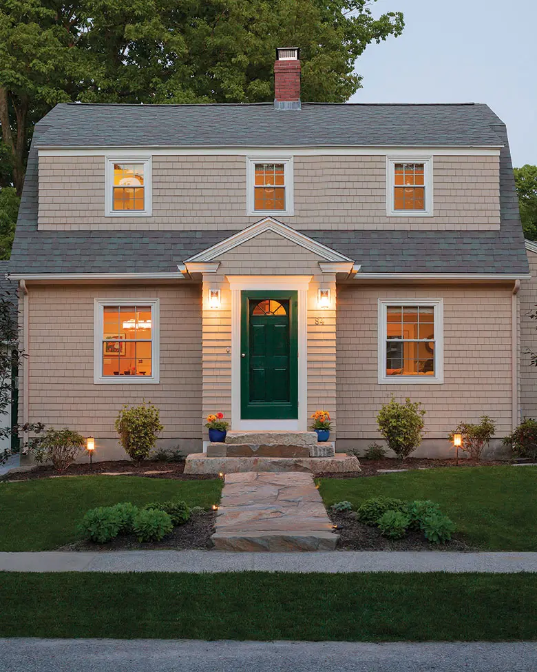 ABOVE In the front yard, he added custom granite steps and a local flagstone walkway. Jennifer Cummings, of Falmouth’s Full Circle Landscaping, collaborated on the plantings.