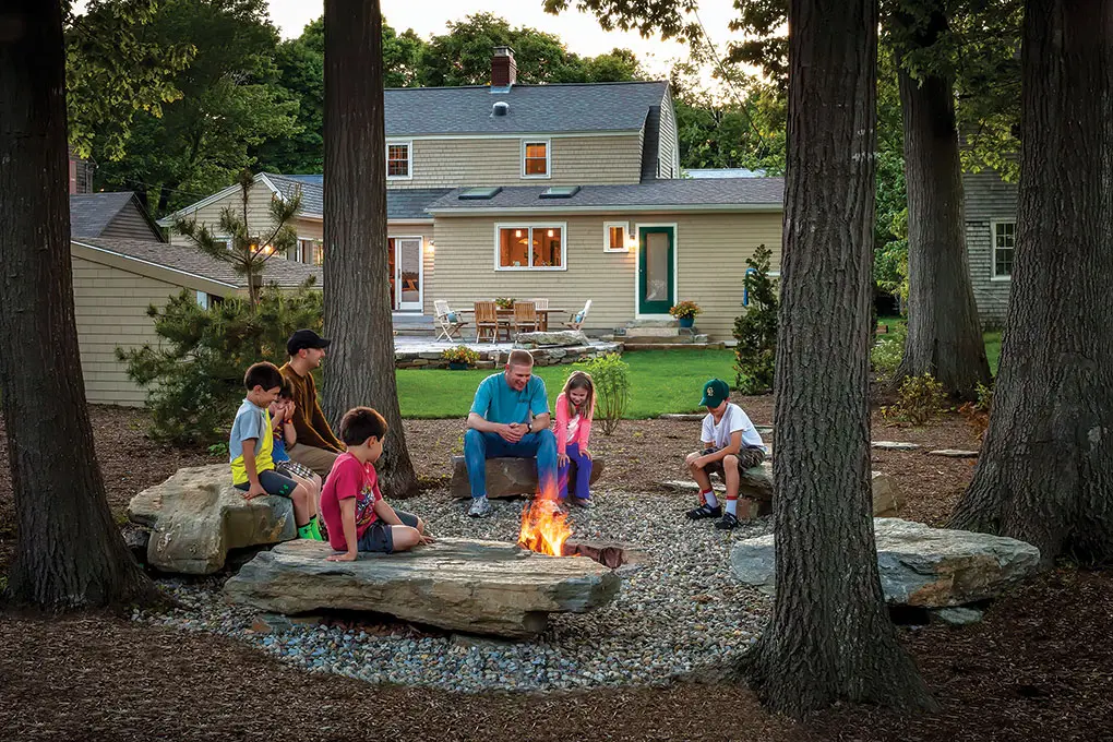 ABOVE In Paul and Mary Bloch’s backyard, landscape designer Keith Stone installed a patio faced in Oak Hill granite from Jefferson’s J.C. Stone on the South Portland side and a firepit tucked among oaks on the Cape Elizabeth side.
