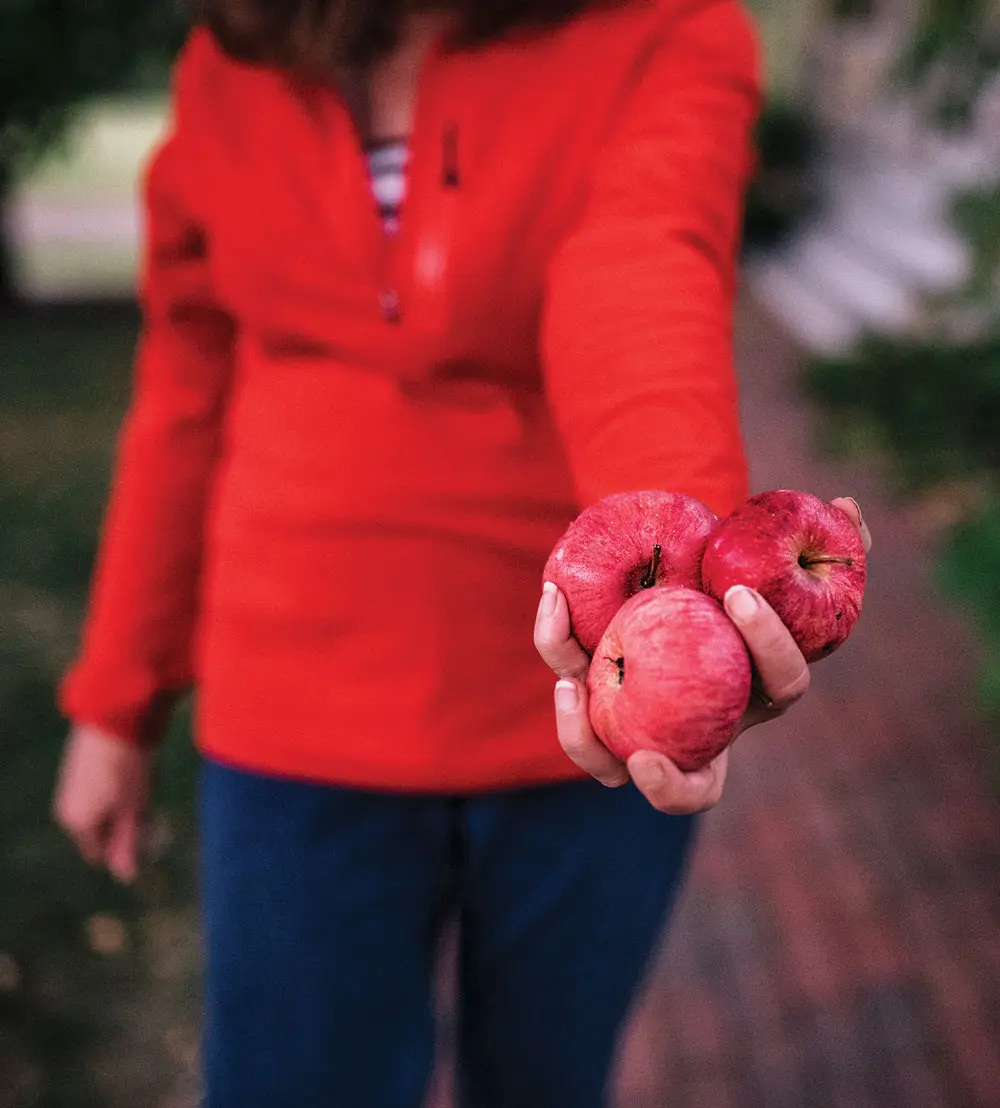 ABOVE 1) Fryer’s top seller is Cafe au Lait, which produces 8-to-10-inch-wide creamy pink blossoms. 2) A handful of Mowfield reds, an antique apple variety not known to grow anywhere other than Fryer’s orchard.