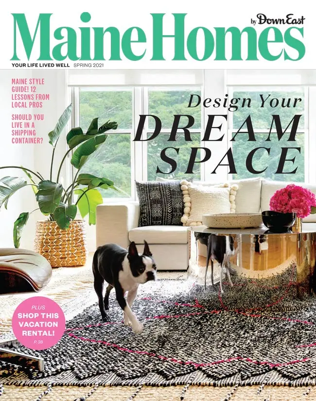 ABOVE Wear and tear trumps pristine in the Demers-McKeen home: In the living room, the footrest is fraying, the rug is faded, and the end table is a soap box a previous owner outfitted with casters and a hinged, carpeted lid. The paintings, though, are fresh and new, and most are by Maine artists, including Daniel Anselmi, Nancy Keenan Barron, John Carnes, Chelsea Ellis, Abbie Read, and Brian White.