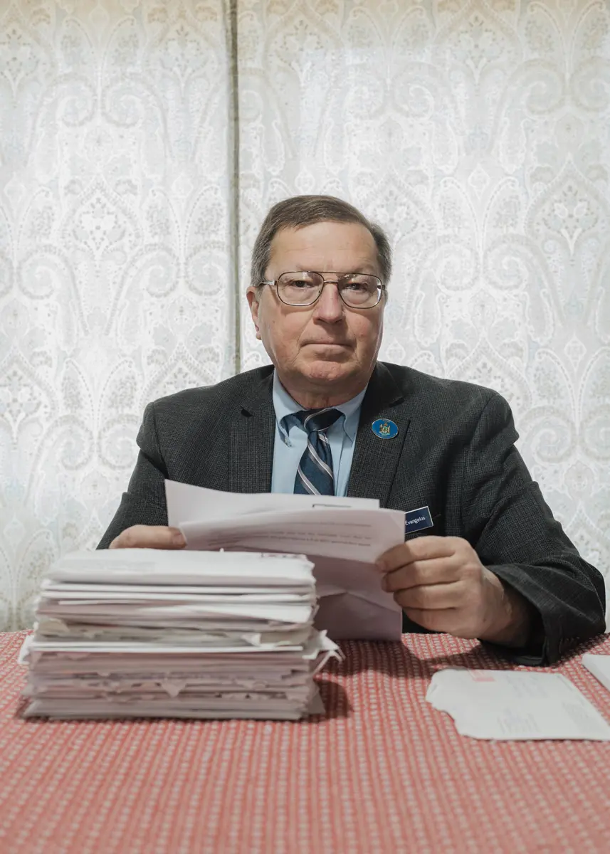 In Augusta, Evangelos has a reputation as an implacable reformer on criminal justice. “People think I’m anti–law enforcement or pro-criminal,” he says, “but my father was a Massachusetts state cop for 23 years. I just want what’s right.” In the past two terms, he introduced a bill to end time limits for post-conviction reviews of new and potentially exonerating evidence, a bill mandating the creation of special integrity units to investigate questionable convictions, and a bill requiring the reassessment of seemingly excessive sentences. Two of the bills stalled in the appropriations committee, and the other died in the Senate.