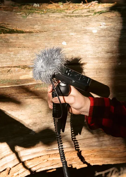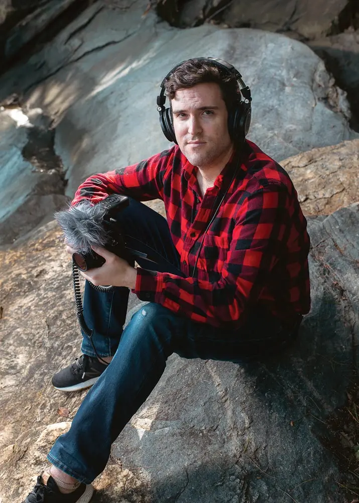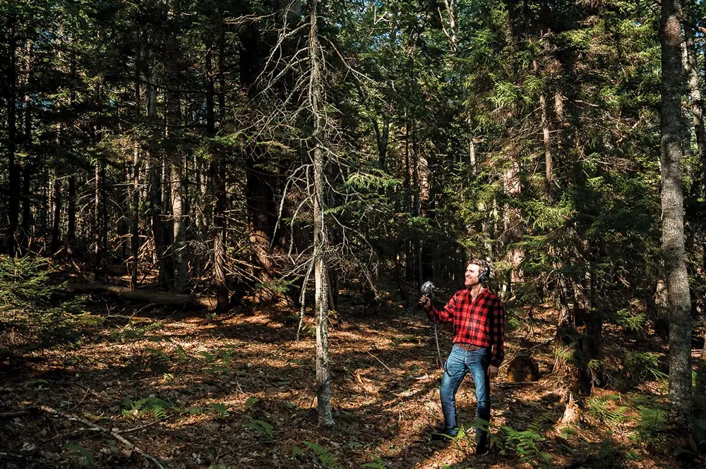 David Bruggink was just a few yards into Harpswell’s Cliff Trail when he heard something in his earphones that he liked. He stopped, held his highly sensitive sound recorder aloft, and listened intently. “Yeah,” he said, nodding, “the birdsong is really nice.” Bruggink mentally filed away the location and moved on. He said he was only mildly concerned that he “probably looks like such a weirdo” recording the soft squelch of his feet treading through a mud puddle and, a little farther along, sticking his mic inside a hollow stump to pick up reverberations imperceptible to the naked ear. “It’s got this weird bass rumble,” he said.