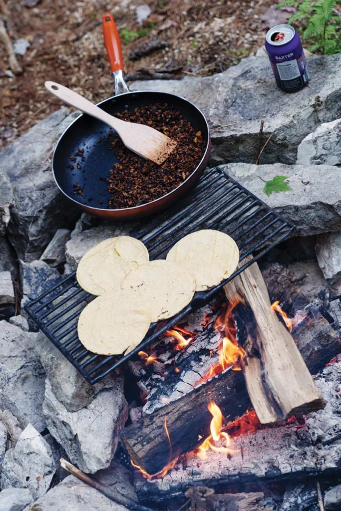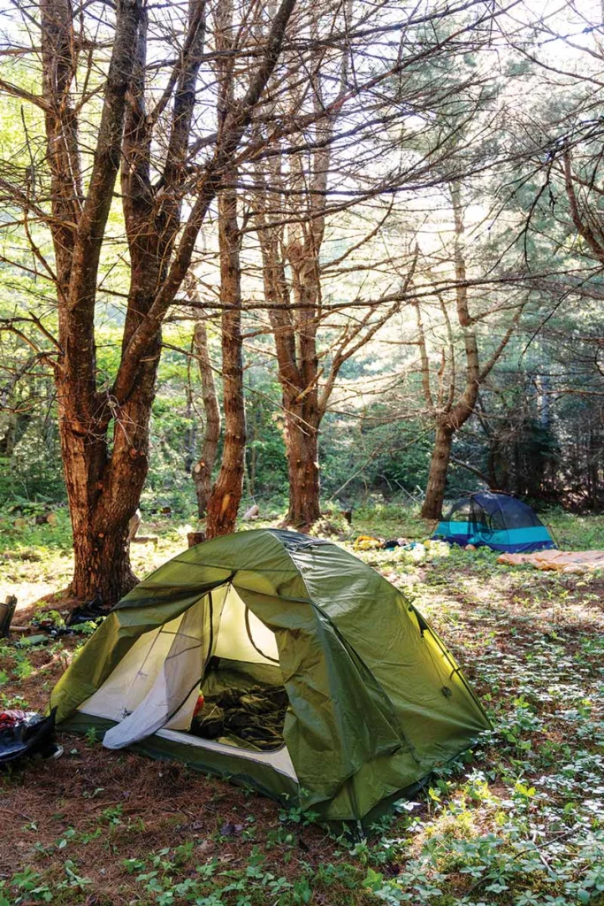After Estey, we paddle a few more miles against the wind into Orange Lake, then stop to rest on a sandy beach, where we all lie down and watch a hundred dragonflies catching blackflies and mosquitoes overhead. It’s a heavenly feeling, sprawling out in the sun with the forest behind us. From the beach, it’s a short paddle to a brand-new MCHT campsite, one of three that the group will make freely reservable next summer. After tacos and beers, we make our way to the edge of the water to watch the sky turn from pink to purple. A few ripples in the water suggest fish stirring — likely bass and pickerel, van de Sande says, the latter introduced illegally in the ’90s. He hops into a canoe with his fly rod in hand and stands alone in the boat, casting towards where we’d seen the ripples, until the light fades and it’s time to retreat into our tents. But he never does catch a fish.