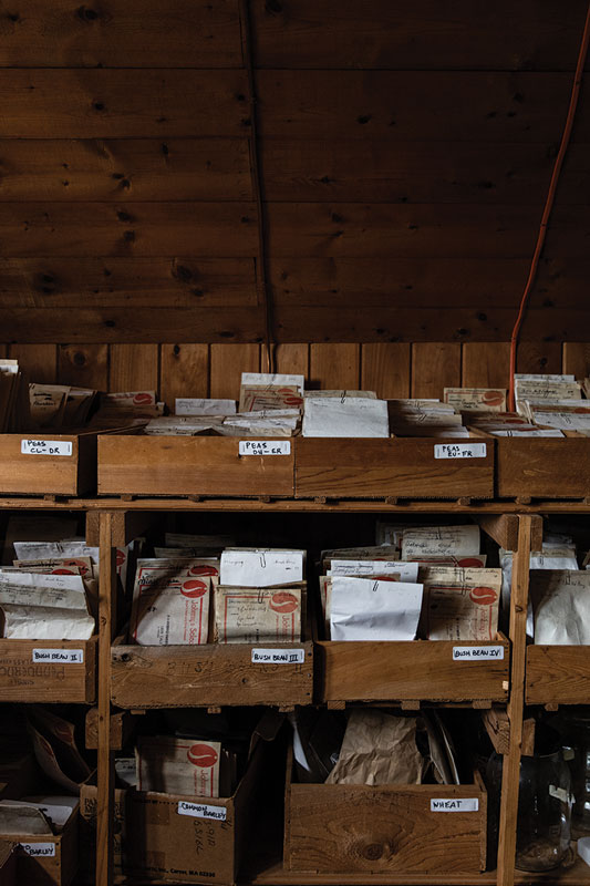 Bonsall led me upstairs, his white ponytail swinging behind him, and into a small room filled with boxes and bags overflowing with dried plant stalks and stems. “Some of the mess is mice,” he said, looking at the floor. Dusty sunlight fell through a window onto a wall of shelves, each one lined with rows of wooden cases the size of shoeboxes. Inside the cases were envelopes, many of them brown with age, and inside the envelopes were seeds — tens of thousands of them, the core of what was once among the country’s most prolific private seed collections.