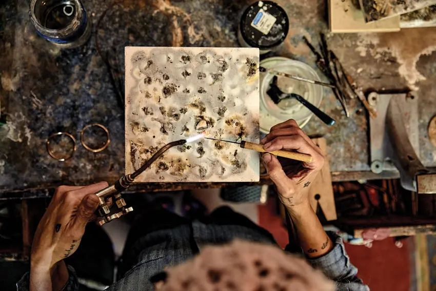 That space hosts Corral’s rather brutal creative process. Next to a shin-high antique Japanese table (where Gil sometimes leads Zoom-guided meditations), a cluttered L-shaped desk is the home base of Loving Anvil, Corral’s jewelry business. Most days, you can find her here, knit cap pressing down her long blonde hair, assaulting gemstones and reclaimed brass, sterling silver, and 14-karat gold to create tiny testaments to a world that, as she sees it, is best confronted with a hammer and torch. “I enjoy the struggle with the metal and stones, and I let it kind of lead me through the process,” she says. “I like the insanity of restricting myself and working small. That becomes the challenge.”