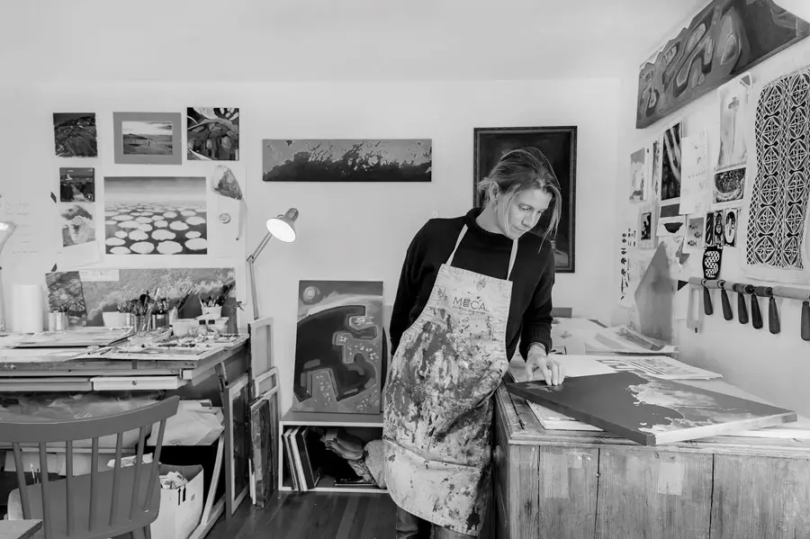 Today, you can find Brown in her Molly Maps studio, in South Portland, creating woodcut prints with puzzle-like coastlines glowing gold against a cobalt sea, watercolor bird’s-eye views of clients’ favorite places, and acrylic landscapes that play with dramatic perspectives. In Raised Along the Penobscot, Maine’s longest river dominates a panorama edged in a mountain-peaked horizon line. In The Owl, Baxter State Park’s boulder-speckled Daicey Pond assumes the convex shape of the earth. “I want you to imagine yourself in the land, but also get the sense that you’re on the planet,” Brown says.