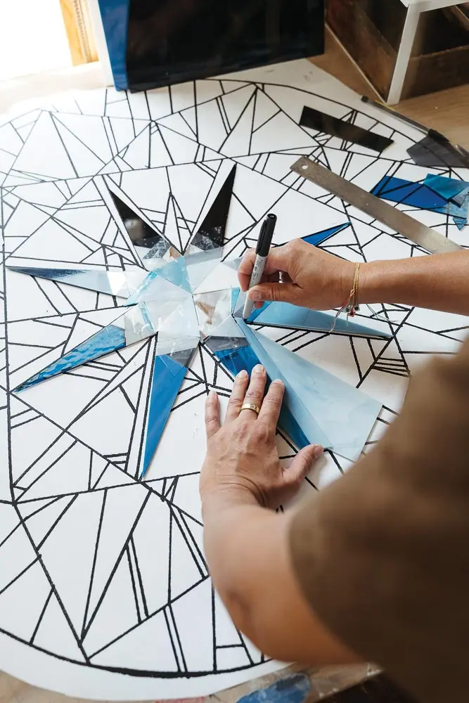 The golden hour in Liz Martone’s Round Pond studio is from one to three in the afternoon. That’s when light pours through the windows on three sides, striking the “disco bubbles” — artful takes on disco balls she fashions from tiny hand-cut mirrored squares attached to irregularly shaped papier-mâché forms — and sending droplets of rainbow-hued light around the room. Other glass mosaics come alive too: glittering serving trays bearing ornate patterns, a skateboard deck depicting Cleopatra in a towering golden headdress (part of Martone’s “Ladies with Funky Hair” series), and multifaceted gems that would make the Hope Diamond look lilliputian. On a large table set before a pair of windows, an intricate drawing of a round diamond is partially filled in with the complex medley of glass shards Martone will affix with grout. The latest in a line of bling that includes amethysts, emeralds, and tourmalines, the nearly three-foot-tall sparkler will eventually be sold and hung on a wall, where it will bounce color and light around another room.