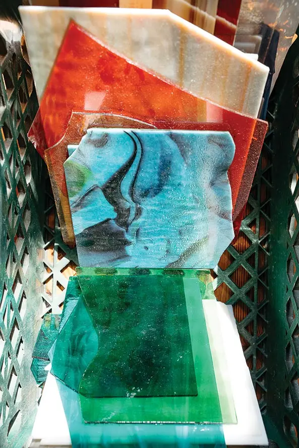 A New Jersey native, Martone studied illustration at Syracuse University, in New York, then landed a job at a mosaics studio in Manhattan, where she found the painstaking nature of inlay work suited her. “My hands are always busy, so I think I just picked up on the tactile quality of glass cutting,” she says. In 2012, she launched her business, EFM Studio, with a line of glass-mosaic gems called “The Rocks That I Got,” after a Jennifer Lopez lyric. “It was about combining my urban environment with science and nature and doing it on a large scale to play with color and light,” she says. Eight years later, she relocated to Round Pond, where her parents own a home. Now, she crafts her baubles in a pine-paneled aerie above the dining room in the 19th-century farmhouse she shares with her husband, Mike Bannon.