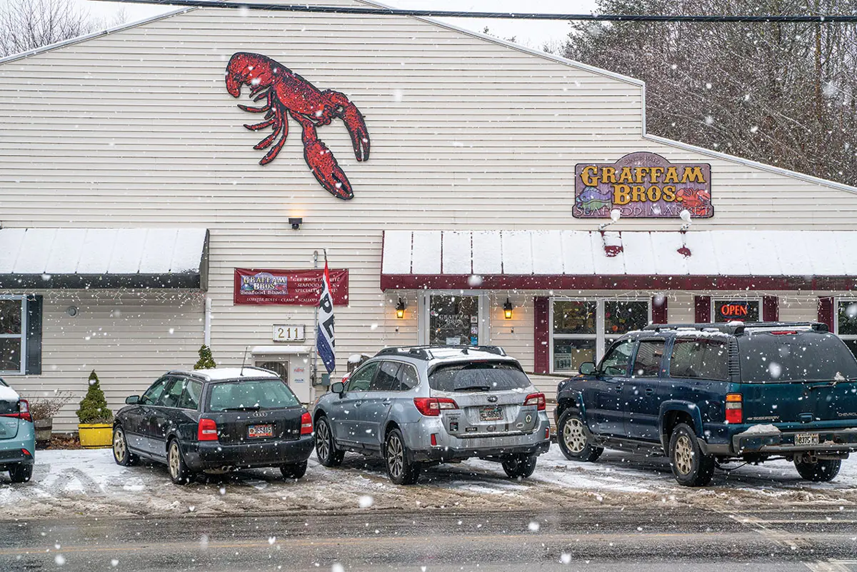 Foot traffic takes a hit in the village when the deep winter sets in. “The fluctuation is very dramatic,” says chef Sara Jenkins, who moved from New York in 2016 to open Nina June, her Mediterranean-style restaurant. In pre-pandemic winters, diners filled Nina June and its neighbor, 18 Central Oyster Bar & Grill, on winter weekend nights, but during the day, a driver passing through the tiny downtown might mistake it for deserted. Just ask Leni Gronros, who last year took to posting corny riddles and puns on a sidewalk sign outside Graffam Bros. Seafood Market, which he runs with his wife, Kimberlee Graffam, in an effort to turn some heads. (A sample: “What do you call a deer with no eyes? Noeyedeah.”)