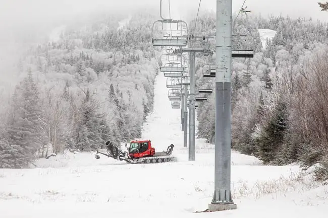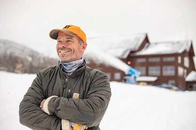 Jared Emerson, who now manages Saddleback operations along with Jim Quimby, grew up skiing Saddleback in the ’80s and ’90s. His grandfather and father were both on the ski patrol, and when Emerson and his sisters were young, the family would drive up from Topsham on weekends, park their pickup out back of the lodge, and plug their camper into the ski-patrol hut for power. “That’s the way we ski-bummed it growing up,” he says. “Fond memories of some cold and windy nights in that camper.”