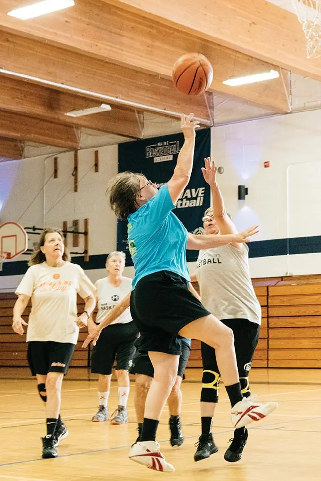 A core group of Pioneers started playing together some 20 years ago, in the 50-and-up bracket, and the name has followed them up the ladder since it was coined in 1999. Coach Elizabeth “Biz” Houghton has been with the team for the last decade. A commanding 6’2″ center for Cape Elizabeth at the turn of the ’80s, Houghton played for Boston College, then professionally in Ireland, and she was inducted last year into the Maine Basketball Hall of Fame. “The dedication of this team is what I love most about them,” the 59-year-old says. “Their lives are busy, but they are here 99 percent of the time, not only because of their passion for basketball but also their passion for being together, for being there for one another.”